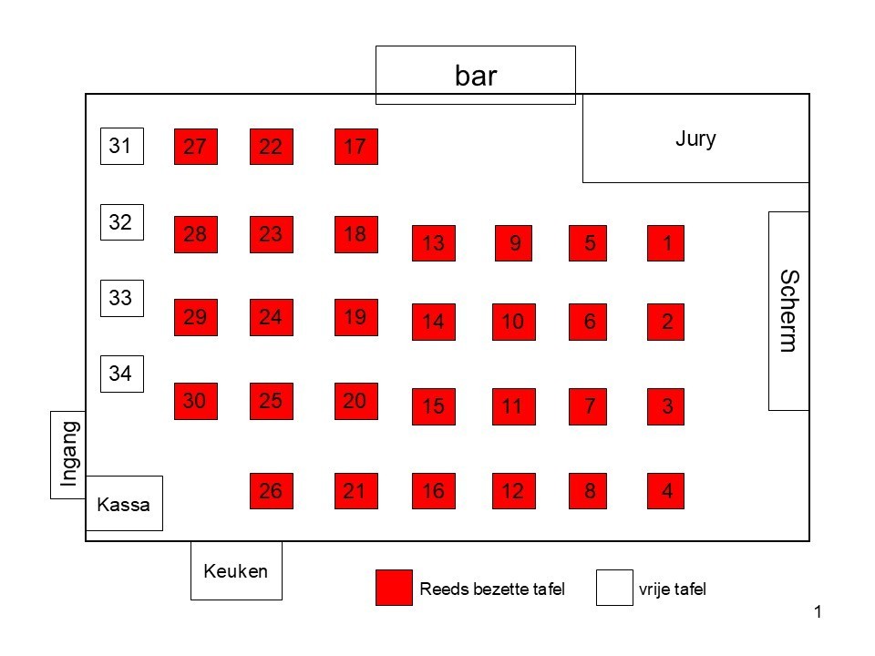 - stuur je een mailtje naar quiz@hadesbbc.be met de naam van je ploeg, de contactpersoon en zijn/haar GSM nummer, en de nummer van je voorkeurstafel (zie plannetje hieronder);